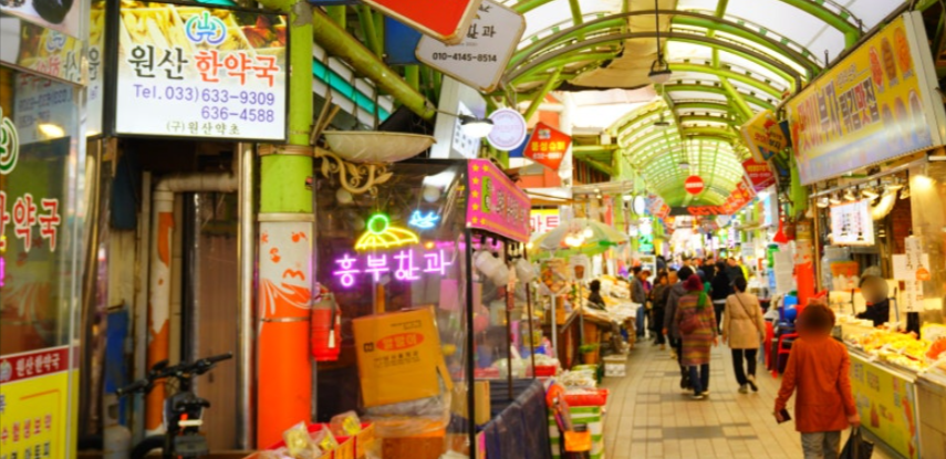 시장에 들어서면 전 부치는 냄새가 가득 퍼져서 자연스럽게 발걸음을 붙잡고, 곳곳에 있는 시식 코너 덕분에 구경만 해도 즐겁습니다.
