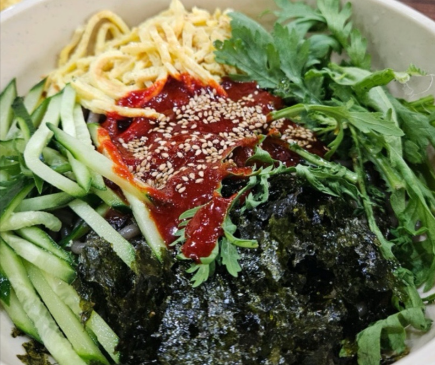 그 위에 오이·김·쑥갓·계란, 그리고 매콤달콤한 양념장까지!
